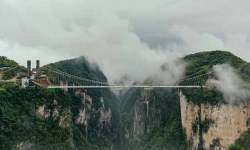 天门山有着是传说中世界上最长的高山索道,索道站就在离火车站很近的市区。8人一厢,40分钟到索道上站。到半山腰开始就满眼就全是白色雾气弥漫,只能看到由远及近的索道轿厢在向自己靠近。